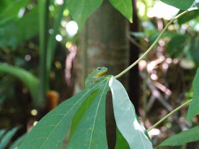 第二隻跟第三隻在告示牌跟解說牌之間的姑婆芋上,其中第三隻被我嚇了一跳,逃往地面去了;