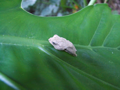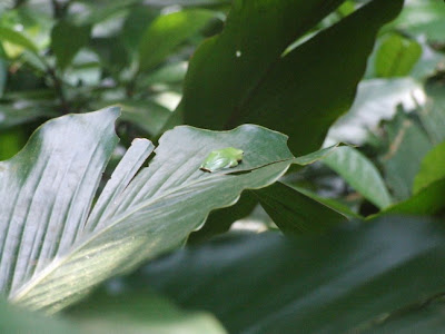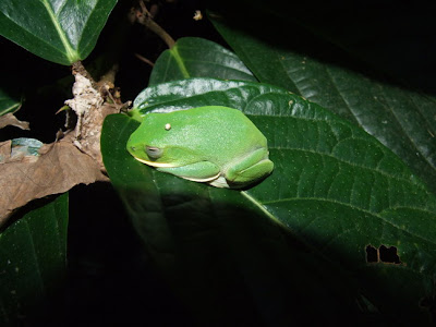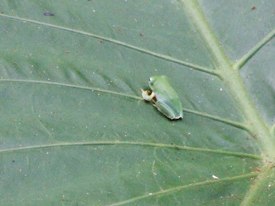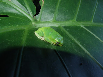 然後是在溼地入口石階右方的姑婆芋上,面天樹蛙一隻;