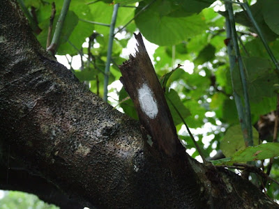 雖然時間很趕(只有80分鐘),我還是趕鴨子似的帶著大隊人馬在園區繞了一大圈,不過沒時間拍照就是了,只有在開始解說前拍了兩張【小朋友】的照片。首先是長吻白蠟蟬的卵,雖然長吻依賴烏桕過活,但是卵卻是在別的樹上發現的;