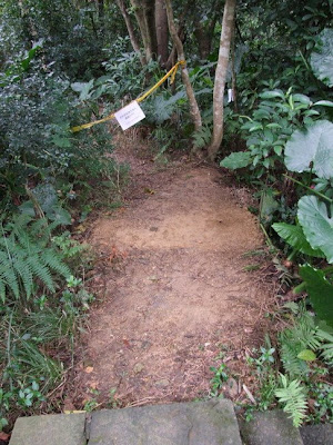 這是自然生態演替區內部被踩扁的小路,跟後方被砍頭的姑婆芋;