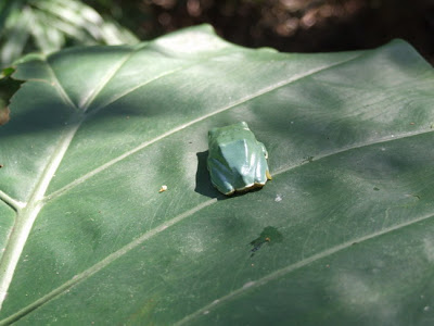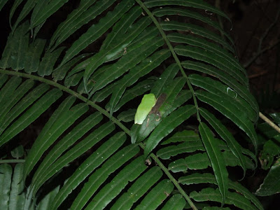 今天運氣不錯,在女廁後方的觀音座蓮葉子上拍到一隻台北,這個區域應該樹蛙很多才對,因為晚上的時候,很多雄蛙在地上的溼土裡面鳴叫,很大聲呢;